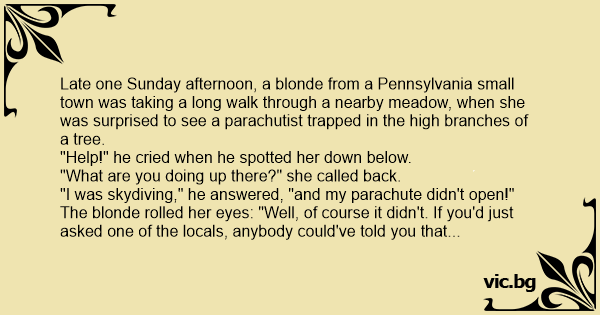 Late one Sunday afternoon, a blonde from a Pennsylvania small town was taking a long walk through a nearby meadow, when she was surprised to see a parachutist trapped in the high branches of a tree.
