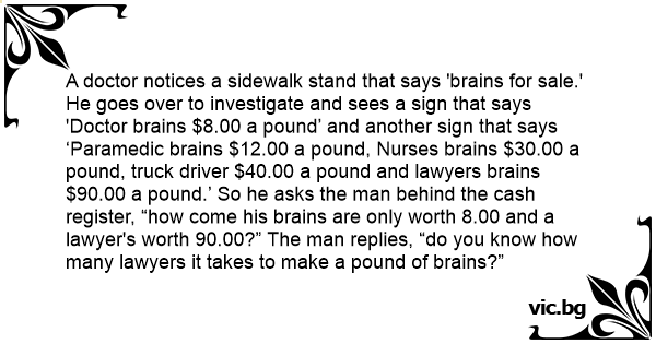 A doctor notices a sidewalk stand that says 'brains for sale.' He goes over to investigate and sees a sign that says 'Doctor brains $8.00 a pound’ and another sign that says ‘Paramedic brains $12.00 a pound, Nurses brains $30.00 a pound, truck driver $40.00 a pound and lawyers brains $90.00 a pound.’ So he asks the man behind the cash register, “how come his brains are only worth 8.00 and a lawyer's worth 90.00?” The man replies, “do you know how many lawyers it takes to make a pound of brains?”