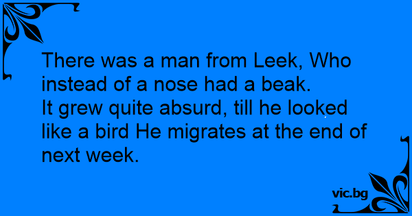 There was a man from Leek, Who instead of a nose had a beak.