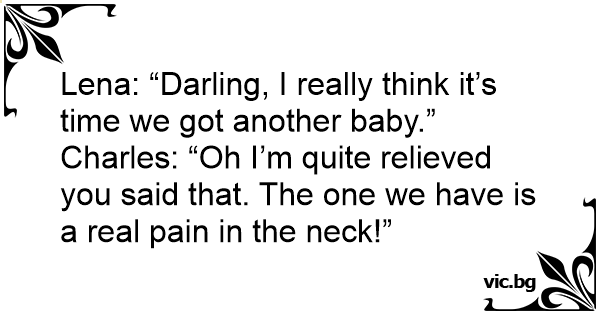 Lena: “Darling, I really think it’s time we got another baby.” Charles: “Oh I’m quite relieved you said that. The one we have is a real pain in the neck!”