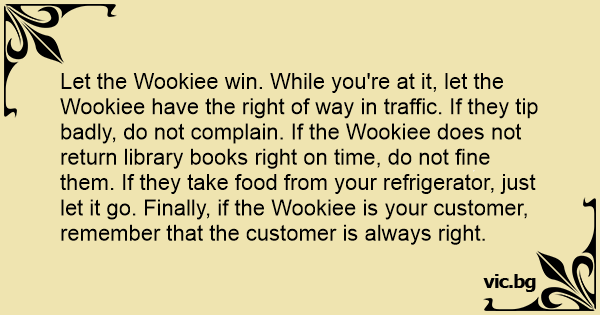 Let the Wookiee win. While you're at it, let the Wookiee have the right of way in traffic. If they tip badly, do not complain. If the Wookiee does not return library books right on time, do not fine them. If they take food from your refrigerator, just let it go. Finally, if the Wookiee is your customer, remember that the customer is always right.