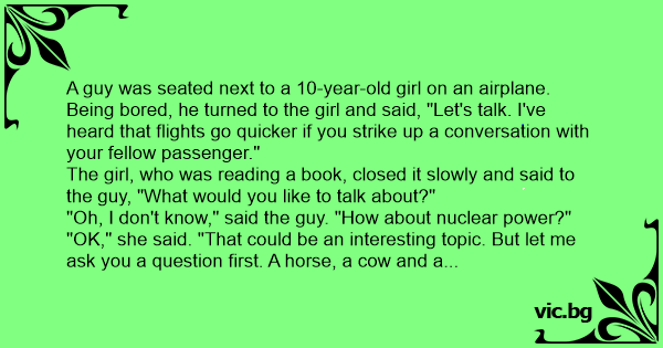 Ein Fremder sitzt im Flugzeug neben einem kleinen Mädchen. Der Fremde wendet sich ihr zu und sagt: "Reden wir ein wenig zusammen? Die Flüge gehen schneller vorüber, wenn man sich unterhält." Das...