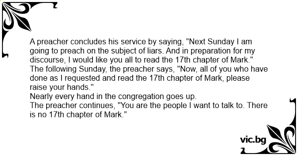 A minister told his congregation, "Next week I plan to preach about the sin of lying. To help you understand my sermon, I want you all to read Mark 17."
