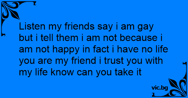 Listen my friends say i am gаy but i tell them i am not because i am not happy in fact i have no life you are my friend i trust you with my life know can you take it