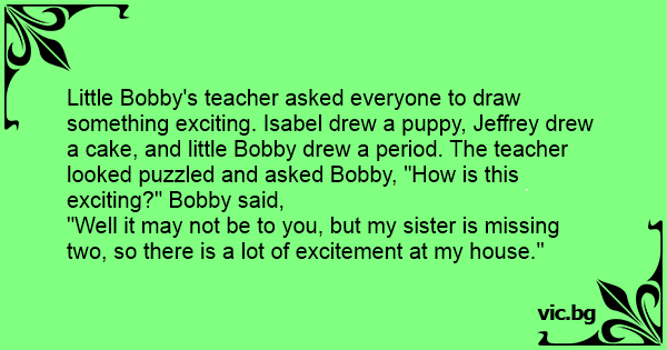 Little Bobby's teacher asked everyone to draw something exciting. Isabel drew a puppy, Jeffrey drew a cake, and little Bobby drew a period. The teacher looked puzzled and asked Bobby, "How is this exciting?" Bobby said,