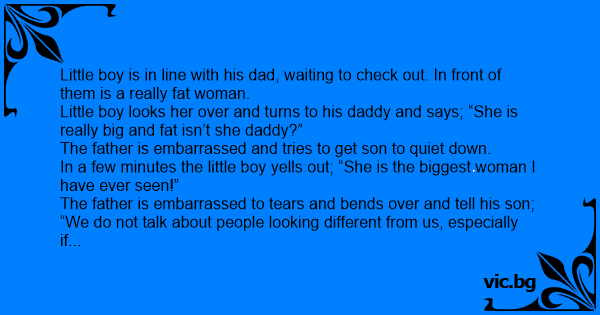 Little boy looks her over and turns to his daddy and says; “She is really big and fат isn’t she daddy?”