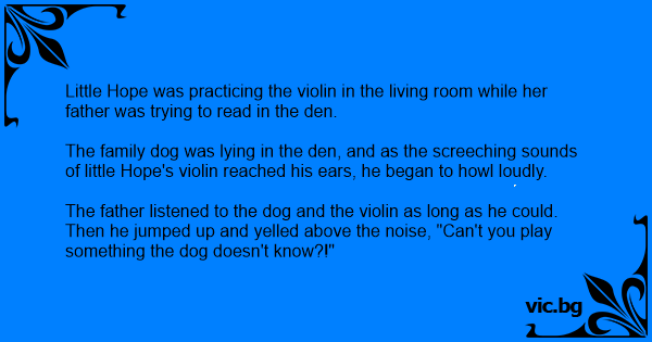 The father listened to the dog and the violin as long as he could. Then he jumped up and yelled above the noise, "Can't you play something the dog doesn't know?!"