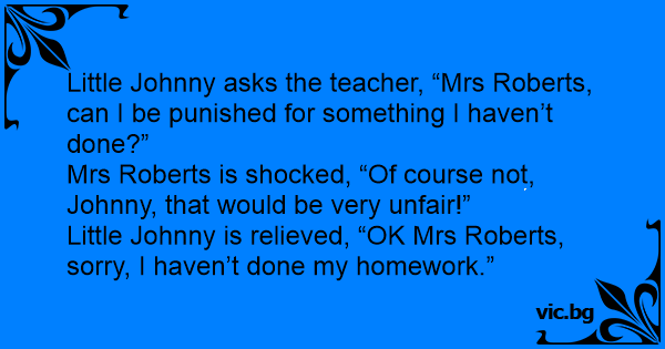 Little Johnny is relieved, “OK Mrs Roberts, sorry, I haven’t done my homework.”