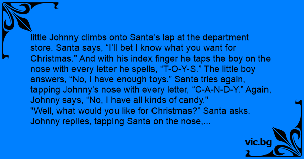"Well, what would you like for Christmas?” Santa asks. Johnny replies, tapping Santa on the nose, “P-U-S-S-Y. And don’t tell me you don’t have any because I can smell it on your finger!”