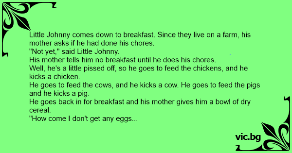 Little Johnny comes down to breakfast. Since they live on a farm, his mother asks if he had done his chores.