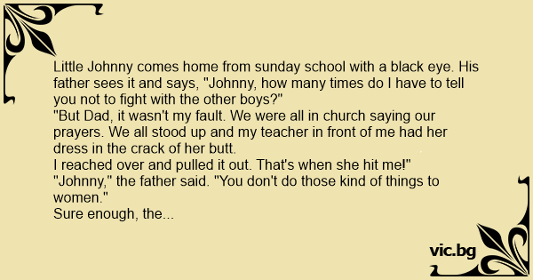 "But Dad," Johnny said, "It wasn't my fault. There we were in church saying our prayers. We all stood up and my teacher in front of us had her dress in the сrаск of her вuтт. Then Louie who was sitting next to me saw it and he reached over and pulled it out.