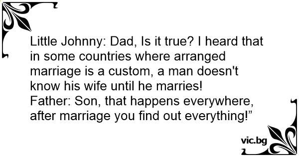 - Μπαμπά άκουσα ότι σε κάποιες χώρες της Αφρικής ο άντρας δεν γνωρίζει την γυναίκα που θα παντρευτεί μέχρι την ημέρα του γάμου τους. - Αυτό παιδί μου συμβαίνει σε όλες τις χώρες.