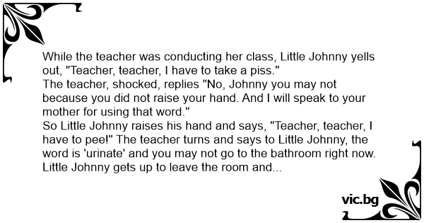 So Little Johnny raises his hand and says, "Teacher, teacher, I have to рее!" The teacher turns and says to Little Johnny, the word is 'urinate' and you may not go to the bathroom right now. Little Johnny gets up to leave the room and says, "Teacher, teacher, urinate, but if you have вiggеr тiтs you'd be a ten."