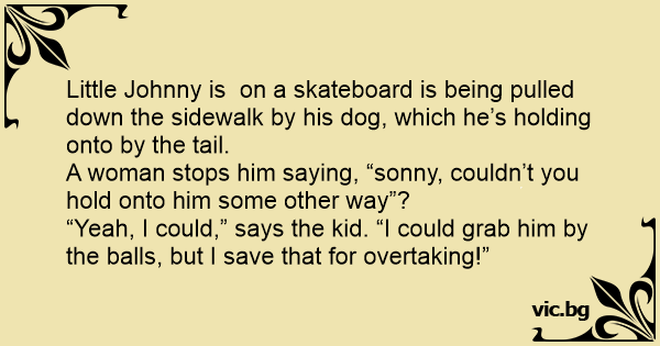 Little Johnny is on a skateboard is being pulled down the sidewalk by his dog, which he’s holding onto by the tail.