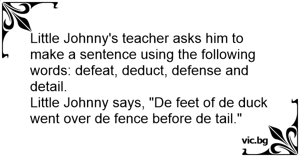Little Johnny's teacher asks him to make a sentence using the following words: defeat, deduct, defense and detail. Little Johnny says, "De feet of de duck went over de fence before de tail."