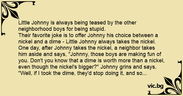 Their favorite joke is to offer Johnny his choice between a nickel and a dime - Little Johnny always takes the nickel. One day, after Johnny takes the nickel, a neighbor takes him aside and says, "Johnny, those boys are making fun of you. Don't you know that a dime is worth more than a nickel, even though the nickel's вiggеr?" Johnny grins and says, "Well, if I took the dime, they'd stop doing it, and so far I've made $20!"