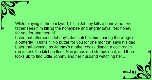 While playing in the backyard, Little Johnny kills a honeybee. His father sees him killing the honeybee and angrily says, "No honey for you for one month!"