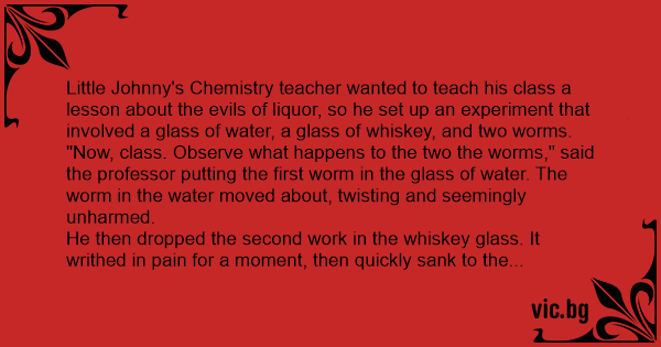 Решила учителката да покаже на децата вредното влияние на алкохола. Събрала ги в класната стая и взела в една ръка купичка пълна с водка, а в другата един червей. Топнала тя червея във водката, а той се сгърчил и умрял.