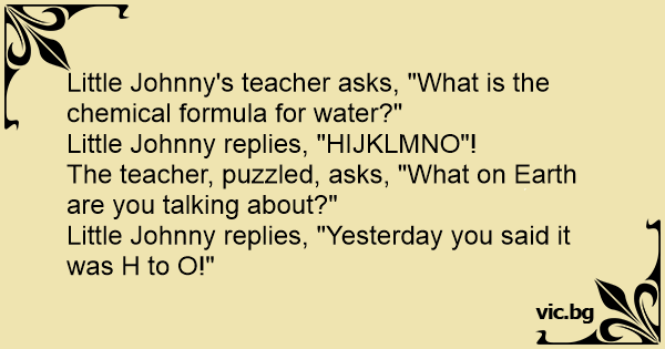 Little Johnny replies, "Yesterday you said it was H to O!"