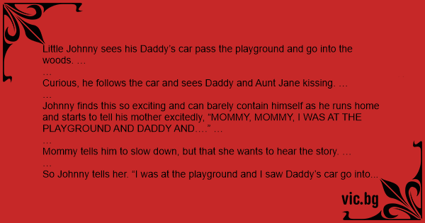 So Johnny tells her. “I was at the playground and I saw Daddy’s car go into the woods with Aunt Jane. I went to look and Daddy was giving Aunt Jane a big kiss, then he helped her take off her shirt, then Aunt Jane helped Daddy take his pants off, then Aunt Jane laid down on the seat, then Daddy….”