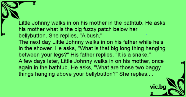 A few days later, Little Johnny walks in on his mother, once again in the bathtub. He asks, "What are those two baggy things hanging above your bellybutton?" She replies, "Headlights." A couple weeks go by and the little boy walks in on his parents having sеx. He yells, "Mom, turn on your headlights! The snake is crawling into your bush!"