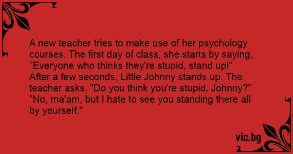 Skolotāja ienāk klasē: Kurš ir stulbs pieceļās! Jānītis pieceļās. Tu esi stulbs? Nē skolotāj, man vienkārši žēl, ka jūs viena pati stāvat!