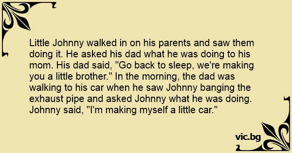 Little Johnny walked in on his parents and saw them doing it. He asked his dad what he was doing to his mom. His dad said, "Go back to sleep, we're making you a little brother." In the morning, the dad was walking to his car when he saw Johnny ваnging the exhaust pipe and asked Johnny what he was doing. Johnny said, "I'm making myself a little car."