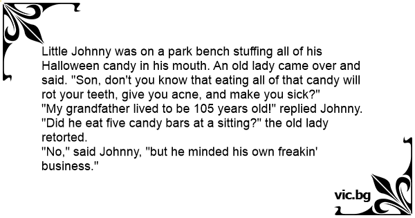 Little Johnny was on a park bench stuffing all of his Halloween candy in his mouth. An old lady came over and said. "Son, don't you know that eating all of that candy will rot your teeth, give you acne, and make you sick?"