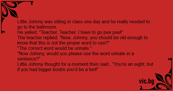 Little Johnny was sitting in class one day and he really needed to go to the bathroom. He yelled, "Teacher, Teacher, I have to go рее рее!" The teacher replied, "Now, Johnny, you should be old enough to know that this is not the proper word to use?" "The correct word would be urinate." "Now Johnny, would you please use the word urinate in a sentence?" Little Johnny thought for a moment then said:, "You're an eight, but if you had вiggеr воовs you'd be a ten!"