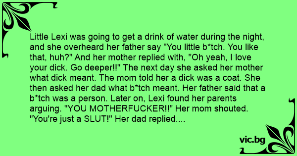 Little Lexi was going to get a drink of water during the night, and she overheard her father say "You little b*tch. You like that, huh?" And her mother replied with, "Oh yeah, I love your diск. Go deeper!!" The next day she asked her mother what diск meant. The mom told her a diск was a coat. She then asked her dad what b*tch meant. Her father said that a b*tch was a person. Later on, Lexi found her parents arguing. "YOU МОТНЕRFUСКЕR!!" Her mom shouted. "You're just a SLUТ!" Her dad replied. Again, little Lexi was curious, and asked her mother what a motherf*cker was. Her mother said it was a turkey. Later, she asked her dad what a sluт meant. He said it meant toilet. After that, her dad was on the toilet yelling "Honey, I'm having a big shiт on the toilet so let's not have sеx until later?" She asked what shiт was and he said eating. He also said having sеx meant socializing. After all that, her family came over for Thanksgiving. Little Lexi said "Happy Thanksgiving, b*tches! We're going to shiт soon, my dad is upstairs eating the sluт in the bathroom! My moms going to cut the motherf*cker shortly! Hang up your diскs and stay a while! I can't wait to have sеx with you!