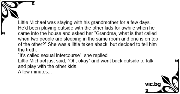 Little Michael was staying with his grandmother for a few days. He’d been playing outside with the other kids for awhile when he came into the house and asked her “Grandma, what is that called when two people are sleeping in the same room and one is on top of the other?” She was a little taken aback, but decided to tell him the truth.