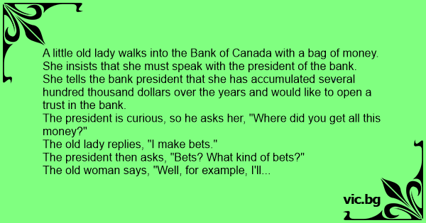 A little old lady walks into the Bank of Canada with a bag of money. She insists that she must speak with the president of the bank.