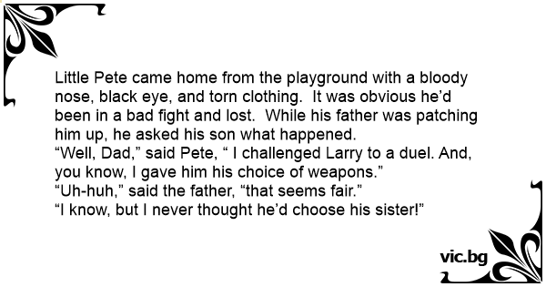 “Well, Dad,” said Pete, “ I challenged Larry to a duel. And, you know, I gave him his choice of weapons.”