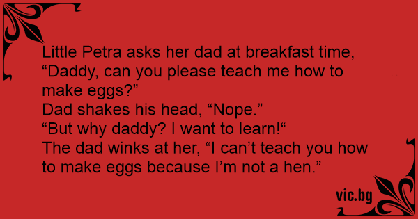 The dad winks at her, “I can’t teach you how to make eggs because I’m not a hen.”