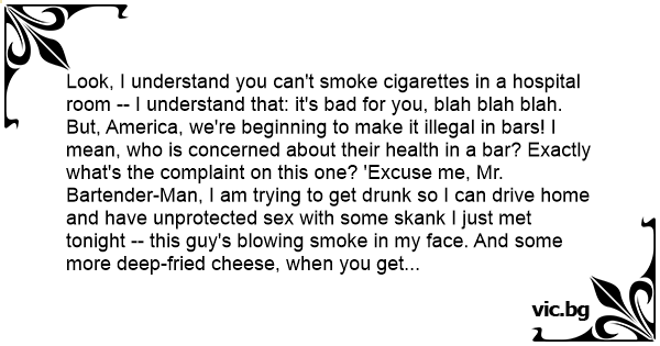Look, I understand you can't smoke cigarettes in a hospital room -- I understand that: it's bad for you, blah blah blah. But, America, we're beginning to make it illegal in bars! I mean, who is concerned about their health in a bar? Exactly what's the complaint on this one? 'Excuse me, Mr. Bartender-Man, I am trying to get drunк so I can drive home and have unprotected sеx with some sкаnк I just met tonight -- this guy's blowing smoke in my face. And some more deep-fried cheese, when you get a chance.'