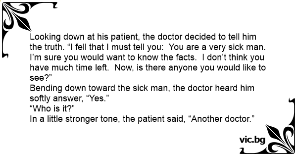 Looking down at his patient, the doctor decided to tell him the truth. “I fell that I must tell you: You are a very sick man. I’m sure you would want to know the facts. I don’t think you have much time left. Now, is there anyone you would like to see?”