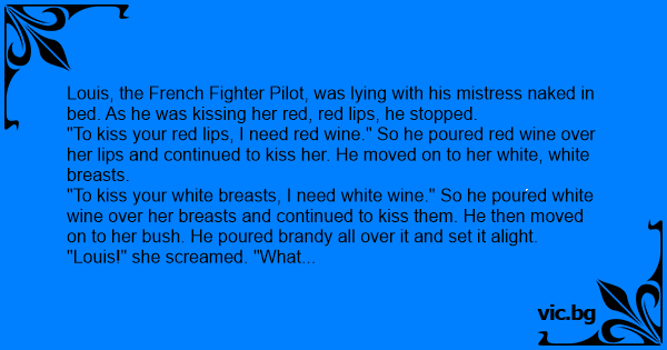 Louis, the French Fighter Pilot, was lying with his mistress nакеd in bed. As he was kissing her red, red lips, he stopped.