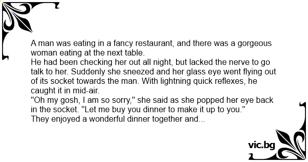 He had been checking her out all night, but lacked the nerve to go talk to her. Suddenly she sneezed and her glass eye went flying out of its socket towards the man. With lightning quick reflexes, he caught it in mid-air.