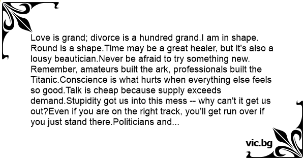 Love is grand; divorce is a hundred grand.I am in shape. Round is a shape.Time may be a great healer, but it's also a lousy beautician.Never be afraid to try something new. Remember, amateurs built the ark, professionals built the Titanic.Conscience is what hurts when everything else feels so good.Talk is cheap because supply exceeds demand.Stupidity got us into this mess -- why can't it get us out?Even if you are on the right track, you'll get run over if you just stand there.Politicians and diapers have one thing in common. They should both be changed regularly and for the same reason.An optimist thinks that this is the best possible world. A pessimist fears that this is true.There is always death and taxes; however, death doesn't get worse every year.People will accept your ideas much more readily if you tell them that Benjamin Franklin said it first.It's easier to fight for one's principles than to live up to them.I don't mind going nowhere as long as it's an interesting path.Anything free is worth what you pay for it.It hurts to be on the cutting edge.If it ain't broke, fix it till it is.I don't get even, I get odder.In just two days, tomorrow will be yesterday.I always wanted to be a procrastinator, never got around to it.I am a nutritional overachiever.My inferiority complex is not as good as yours.I am having an out of money experience.I plan on living forever! So far, so good!Not afraid of heights -- afraid of widths.Practice safe eating -- always use condiments.A day without sunshine is like night.I have kleptomania, but when it gets bad, I take something for it.If marriage were outlawed, only outlaws would have in-laws.Life is an endless struggle full of frustrations and challenges, but eventually, you find a hair stylist you like.You're getting old when you get the same sensation from a rocking chair that you once got from a roller coaster.It's frustrating when you know all the answers, but nobody bothers to ask you the questions.The real art of conversation is not only to say the right thing at the right time, but also, to leave unsaid the wrong thing at the tempting moment.Brain cells come and brain cells go, but fат cells live forever.Age doesn't always bring wisdom. Sometimes, age comes alone.Life not only begins at forty, it begins to show.You don't stop laughing because you grow old, you grow old because you stopped laughing!!