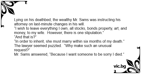 Lying on his deathbed, the wealthy Mr. Sams was instructing his attorney on last-minute changes in his will.