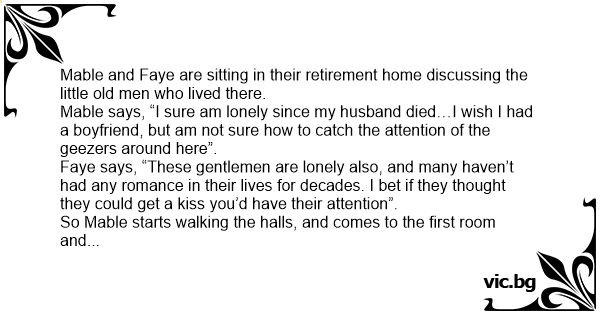 Mable and Faye are sitting in their retirement home discussing the little old men who lived there.