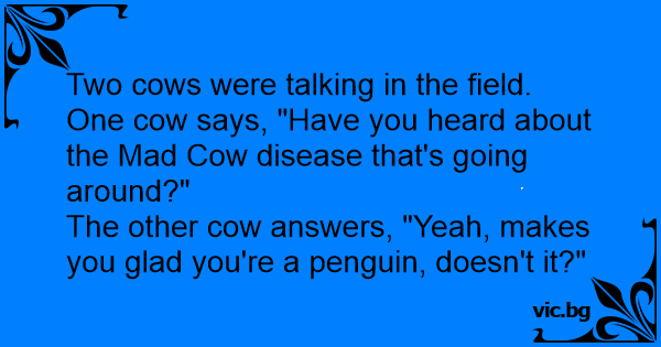Two cows were talking in the field. One соw says, "Have you heard about the Mad Соw disease that's going around?"