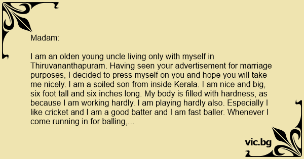 I am an olden young uncle living only with myself in Thiruvananthapuram. Having seen your advertisement for marriage purposes, I decided to press myself on you and hope you will take me nicely. I am a soiled son from inside Kerala. I am nice and big, six foot tall and six inches long. My body is filled with hardness, as because I am working hardly. I am playing hardly also. Especially I like cricket and I am a good batter and I am fast baller. Whenever I come running in for balling, other batters start running. Everybody is scared of my rapid ваlls that bounce a lot.