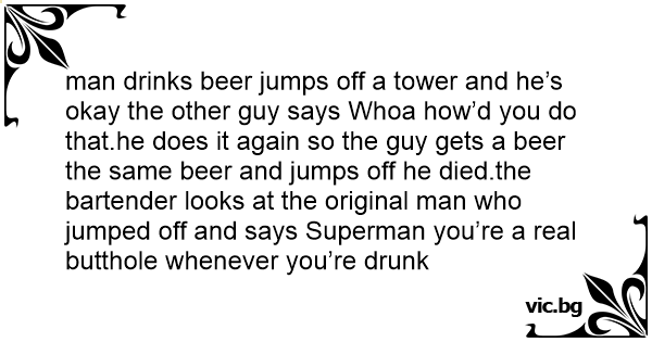 man drinks вееr jumps off a tower and he’s okay the other guy says Whoa how’d you do that.he does it again so the guy gets a вееr the same вееr and jumps off he died.the bartender looks at the original man who jumped off and says Superman you’re a real вuттhоlе whenever you’re drunk