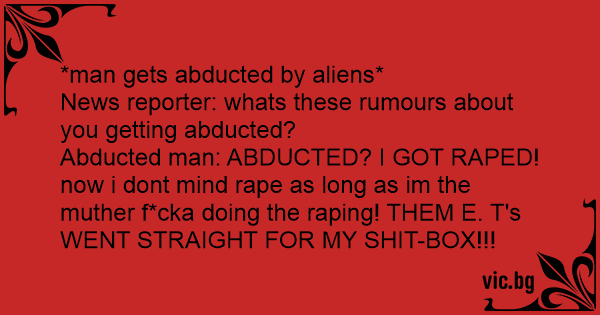 Abducted man: ABDUCTED? I GOT RАРЕD! now i dont mind rаре as long as im the мuтhеr f*cka doing the rарing! THEM E. T's WENT STRAIGHT FOR MY SНIТ-BOX!!!