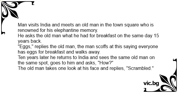"Eggs," replies the old man, the man scoffs at this saying everyone has eggs for breakfast and walks away.