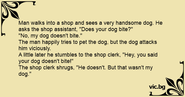 A man walks into a shop and sees a cute little dog. He asks the shopkeeper, "Does your dog bite?" The shopkeeper says, "No, my dog does not bite." The man tries to pet the dog and the dog bites him. "Ouch!" He says, "I thought you said your dog does not bite!" The shopkeeper replies, "That is...