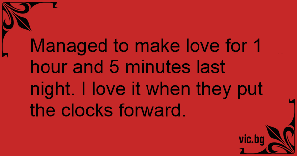 Managed to make love for 1 hour and 5 minutes last night. I love it when they put the clocks forward.