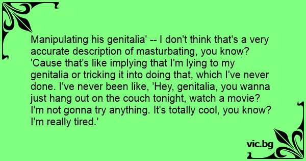 Manipulating his genitalia' -- I don't think that's a very accurate description of маsтurватing, you know? 'Cause that's like implying that I'm lying to my genitalia or tricking it into doing that, which I've never done. I've never been like, 'Hey, genitalia, you wanna just hang out on the couch tonight, watch a movie? I'm not gonna try anything. It's totally cool, you know? I'm really tired.'