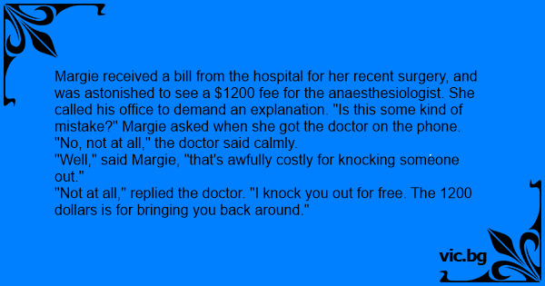Margie received a bill from the hospital for her recent surgery, and was astonished to see a $1200 fee for the anaesthesiologist. She called his office to demand an explanation. "Is this some kind of mistake?" Margie asked when she got the doctor on the phone.